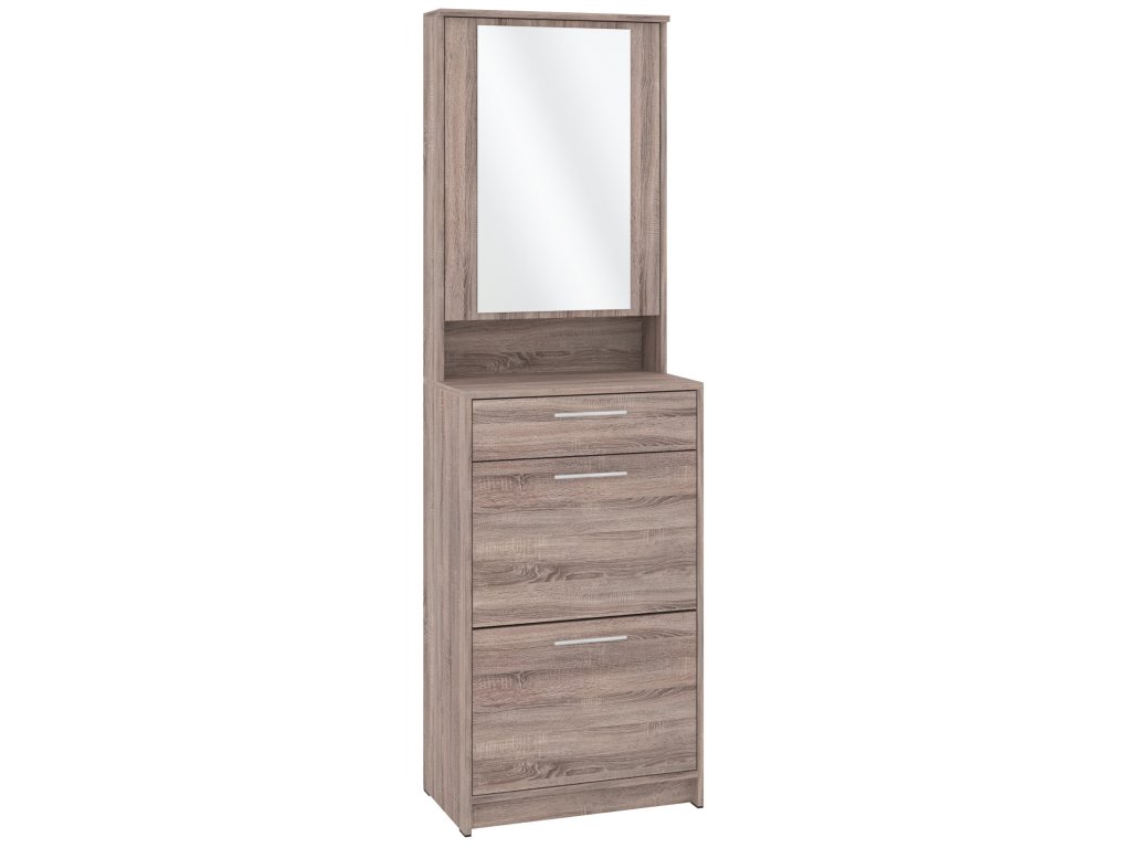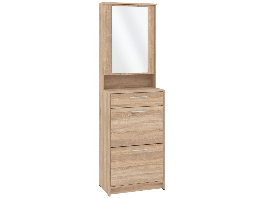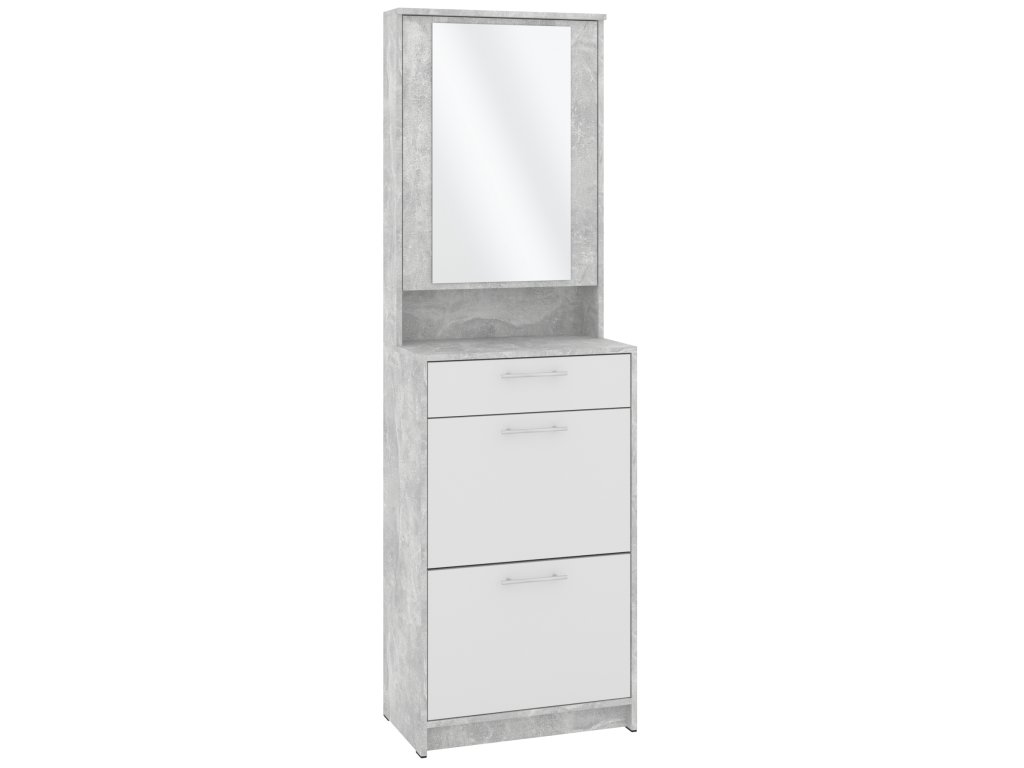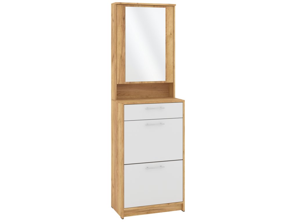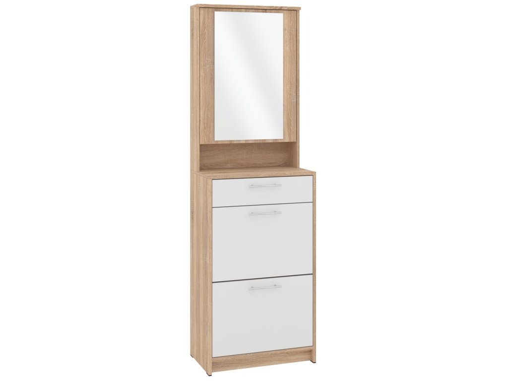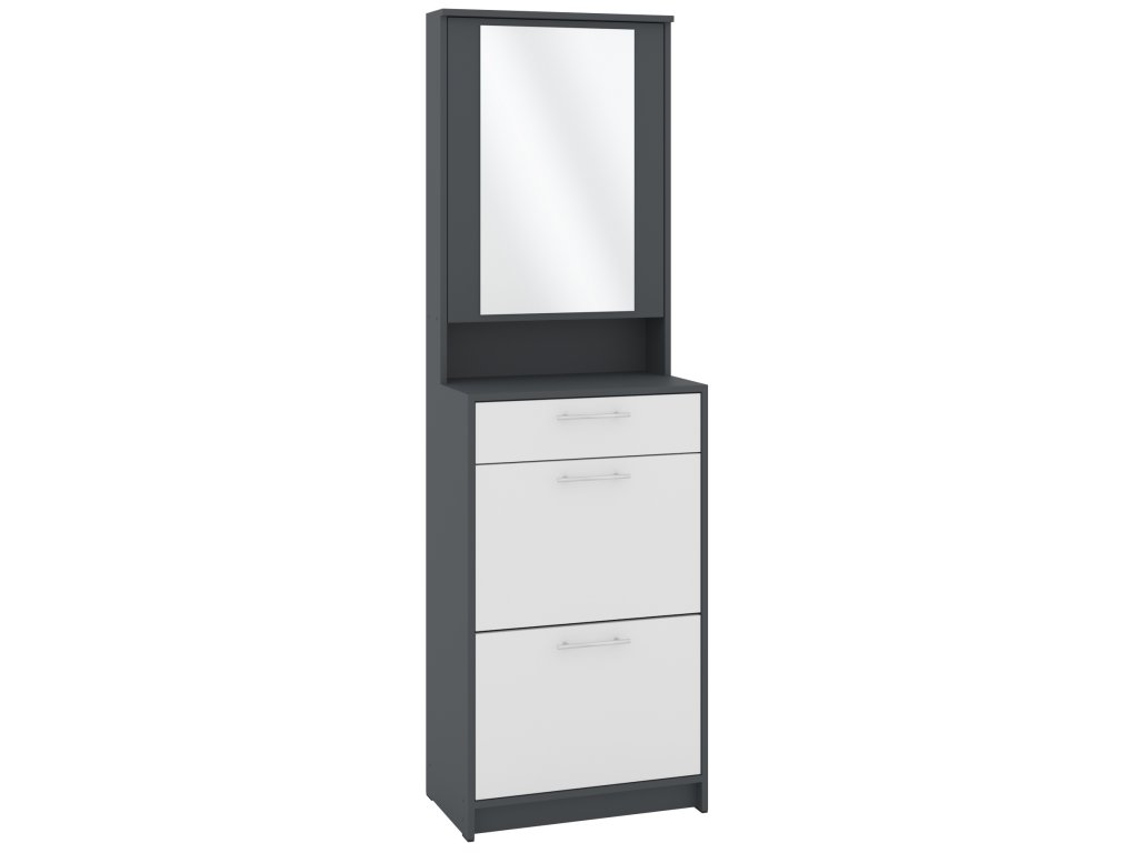 Výklopná konstrukce nabízí snadný přístup k vašim oblíbeným botám, zatímco zásuvka a skříňka s praktickým zrcadlem poskytují dostatek místa pro uložení dalších věcí, jako jsou klíče, čepice nebo rukavice. Skříňka se zrcadlem je navíc skvělým pomocníkem při poslední kontrole před odchodem z domu. Tato kombinace moderního designu a praktických funkcí dělá z tohoto botníku skvělou volbu pro každého, kdo hledá stylový a funkční nábytek do své předsíně.