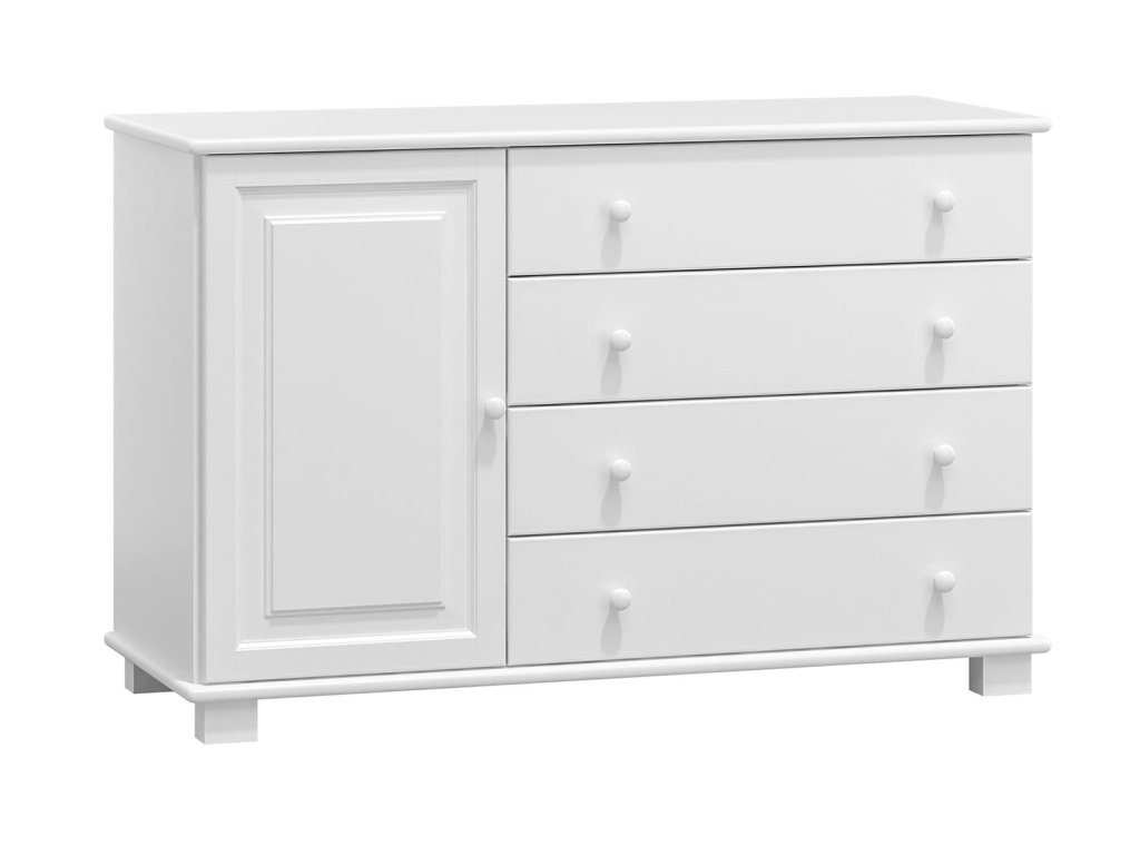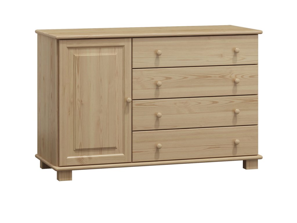 Dřevěná komoda CLASSIC KN-34 kombinuje tradiční vzhled přírodního masivu borovice s praktickou funkcionalitou. Tato zásuvková komoda s dvířky je vyrobena z prvotřídního borovicového dřeva o síle 2,2 cm, což zajišťuje vysokou pevnost a dlouhou životnost.