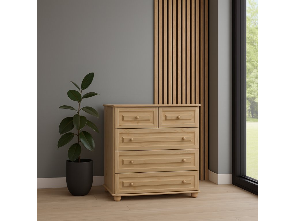 Komoda CLASSIC KN-4 z masivu borovice první jakosti kombinuje pevnou konstrukci, praktické uspořádání zásuvek a přirozenou krásu dřeva. Tento nadčasový kus nábytku se hodí do různých typů interiérů a přináší vysokou kvalitu a dlouhou životnost.