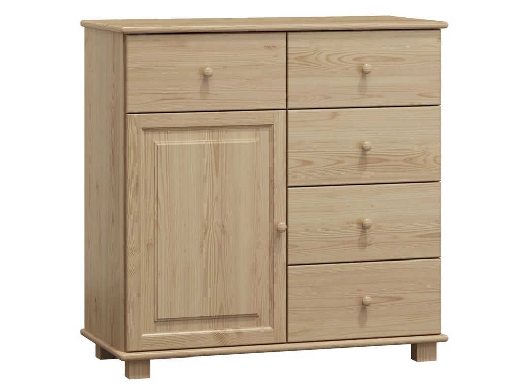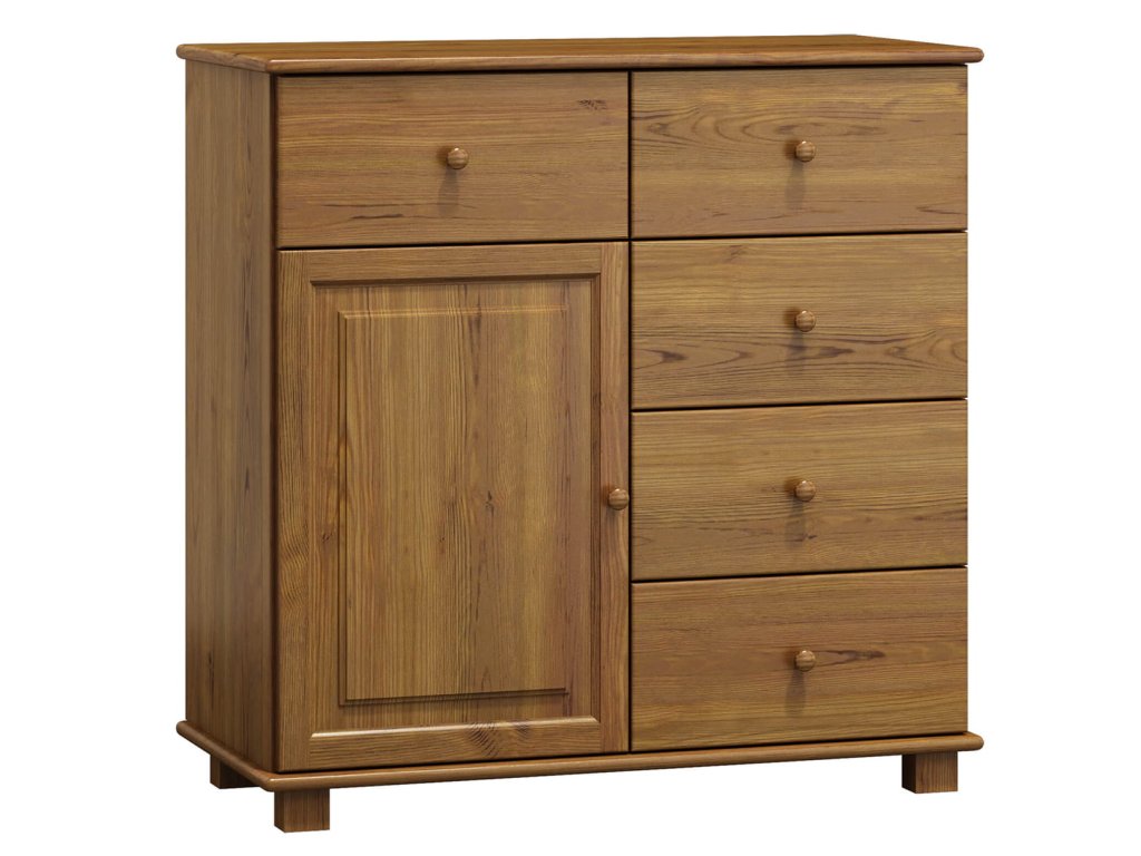 Komoda je vyrobena z masivu borovice první jakosti o síle 2,2 cm. Díky robustní konstrukci je stabilní, pevná a odolná vůči běžnému každodennímu používání. Přírodní borovicové dřevo navíc vyniká krásnou kresbou a vytváří v interiéru příjemnou a útulnou atmosféru.