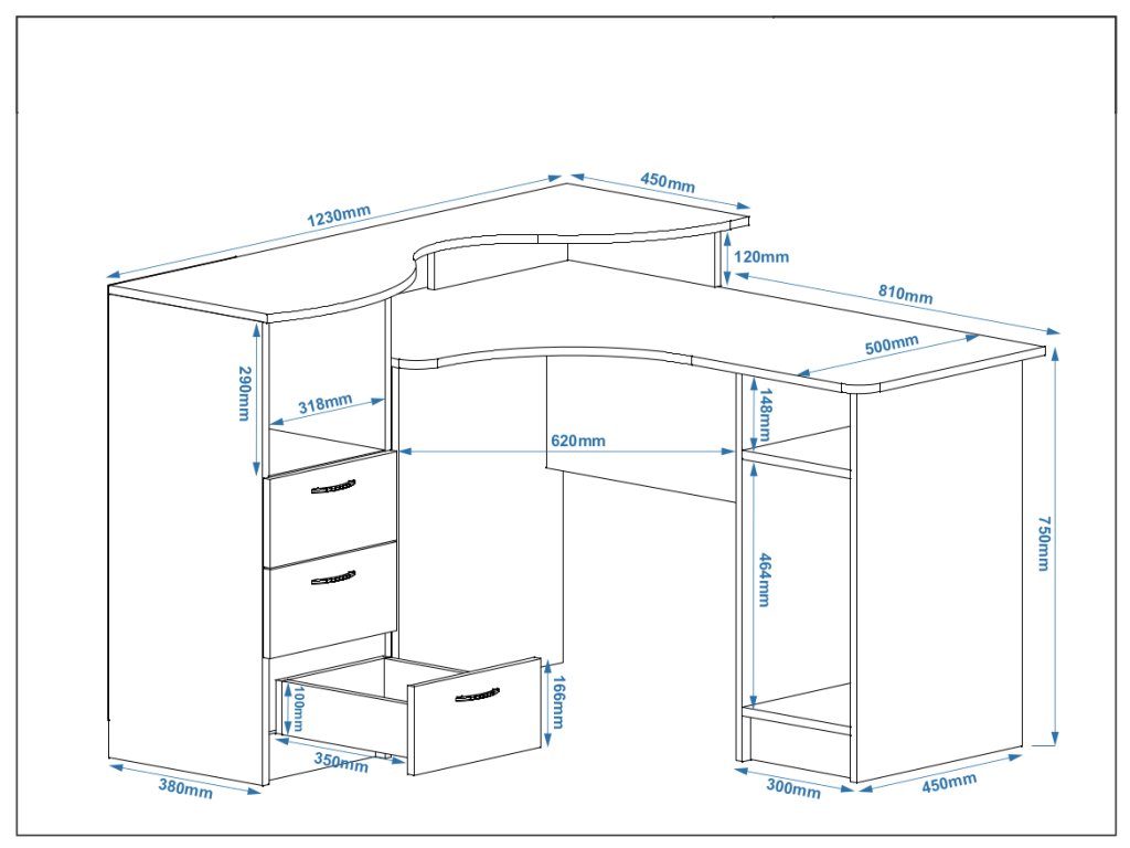 - Velkorysý pracovní prostor – dostatek místa pro počítač, psací potřeby a další pracovní materiály.