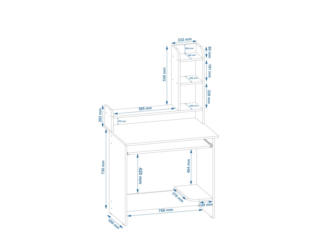 - Dodatečný úložný prostor: Nástavec nabízí úložné police, které pomáhají udržet pracovní plochu přehlednou a organizovanou.