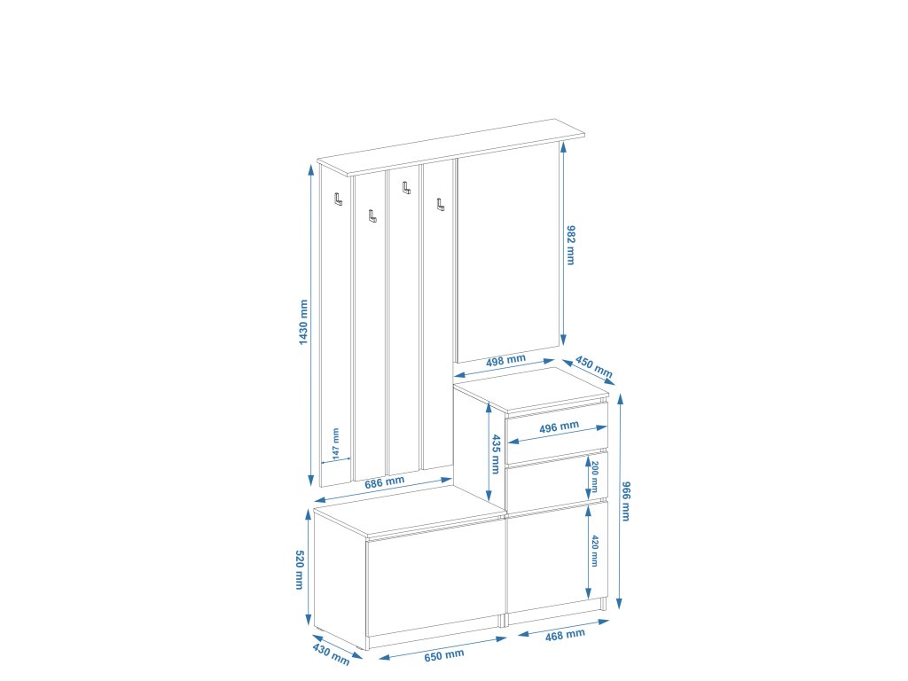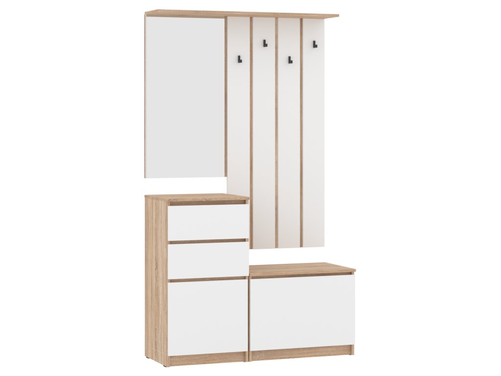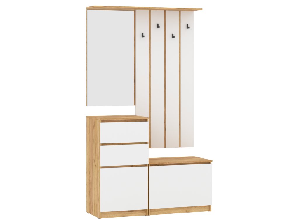 Díky zrcadlu si můžete rychle upravit vzhled před odchodem, zatímco věšák poskytuje dostatek prostoru pro kabáty, bundy nebo klíče. Dvě praktické zásuvky vám umožní uschovat drobnosti, které chcete mít po ruce, jako jsou rukavice nebo peněženka. Policový botník je ideálním místem pro uložení bot, což zajistí, že vaše předsíň zůstane vždy v pořádku.