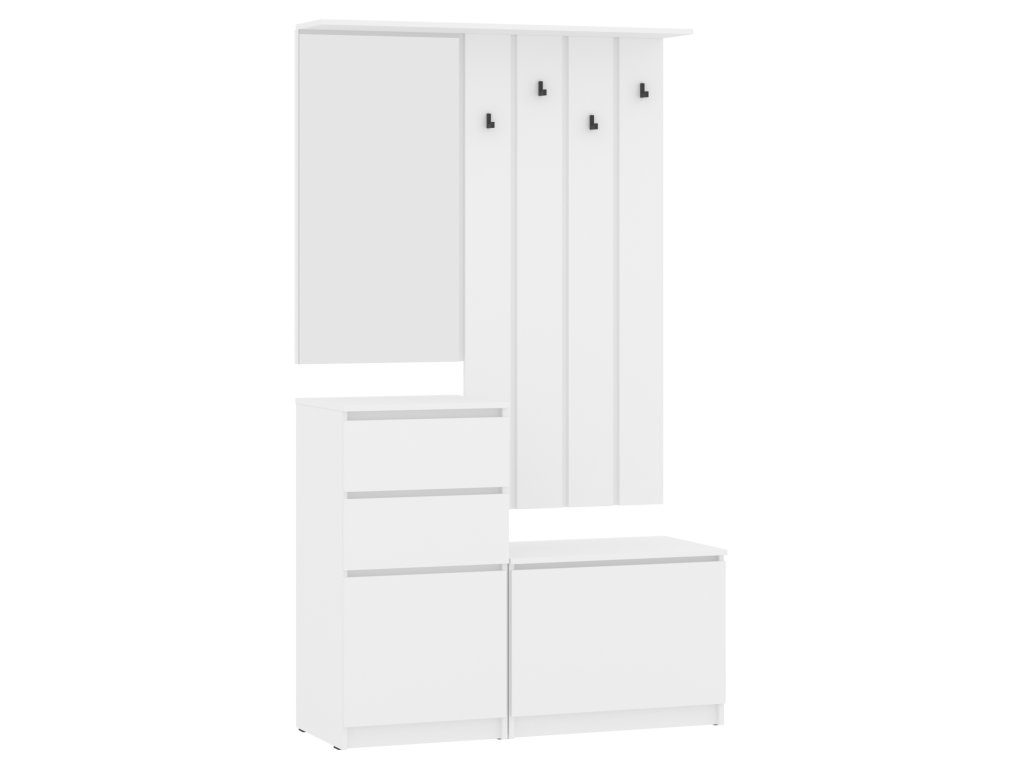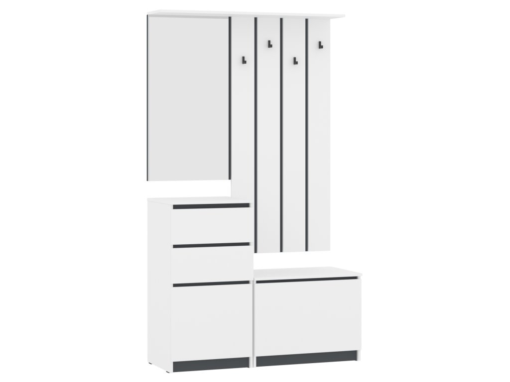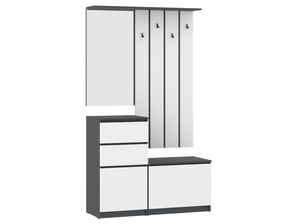 Moderní předsíňová stěna NEW SYSTEM se zrcadlem, věšákem, zásuvkami a botníkem. Předsíňová stěna NEW SYSTEM je ideálním řešením pro vaši předsíň, která spojí funkčnost a moderní design. Tato kompaktní, ale praktická sestava nabízí vše, co potřebujete pro úhledný a uspořádaný vstup do vašeho domova.
