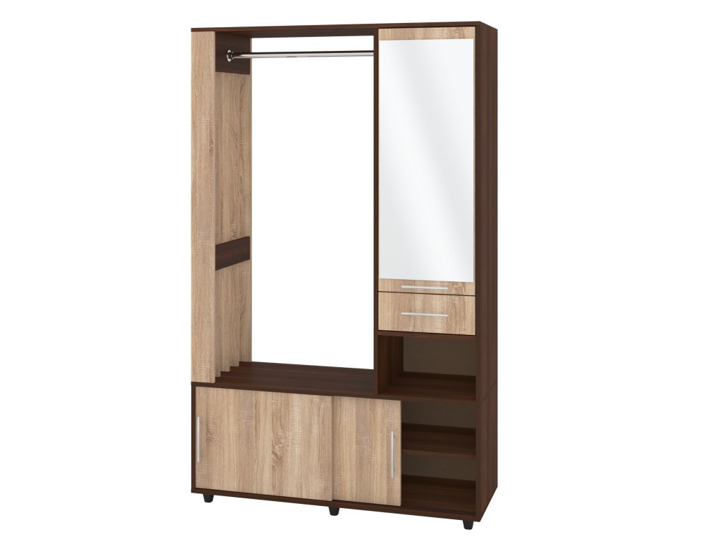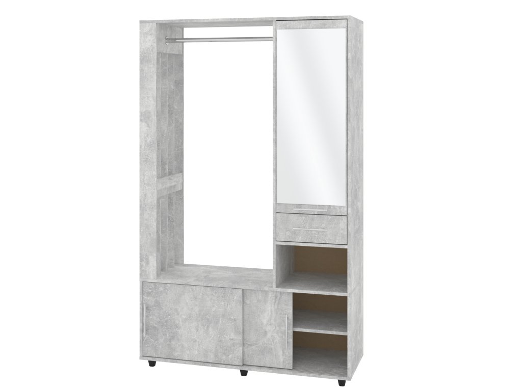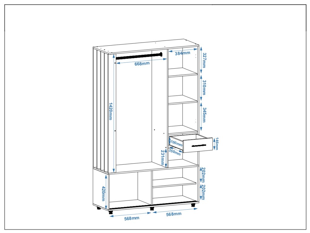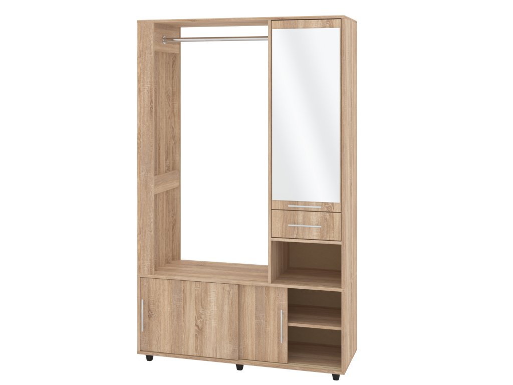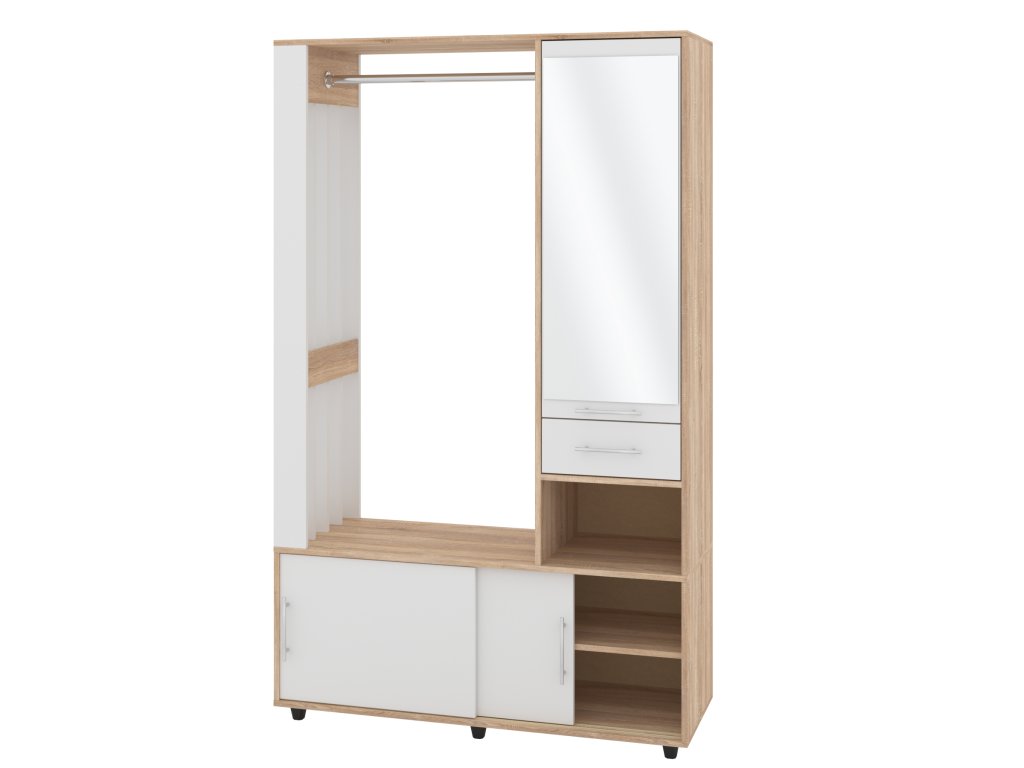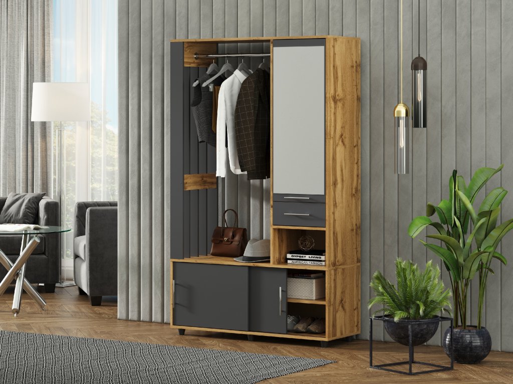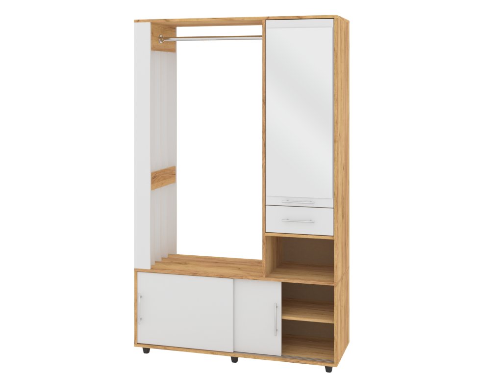 - Praktické uspořádání: Šatní tyč pro zavěšení kabátů a bund, botník s posuvnými dvířky pro úhledné uložení obuvi a zásuvka pro drobnosti.