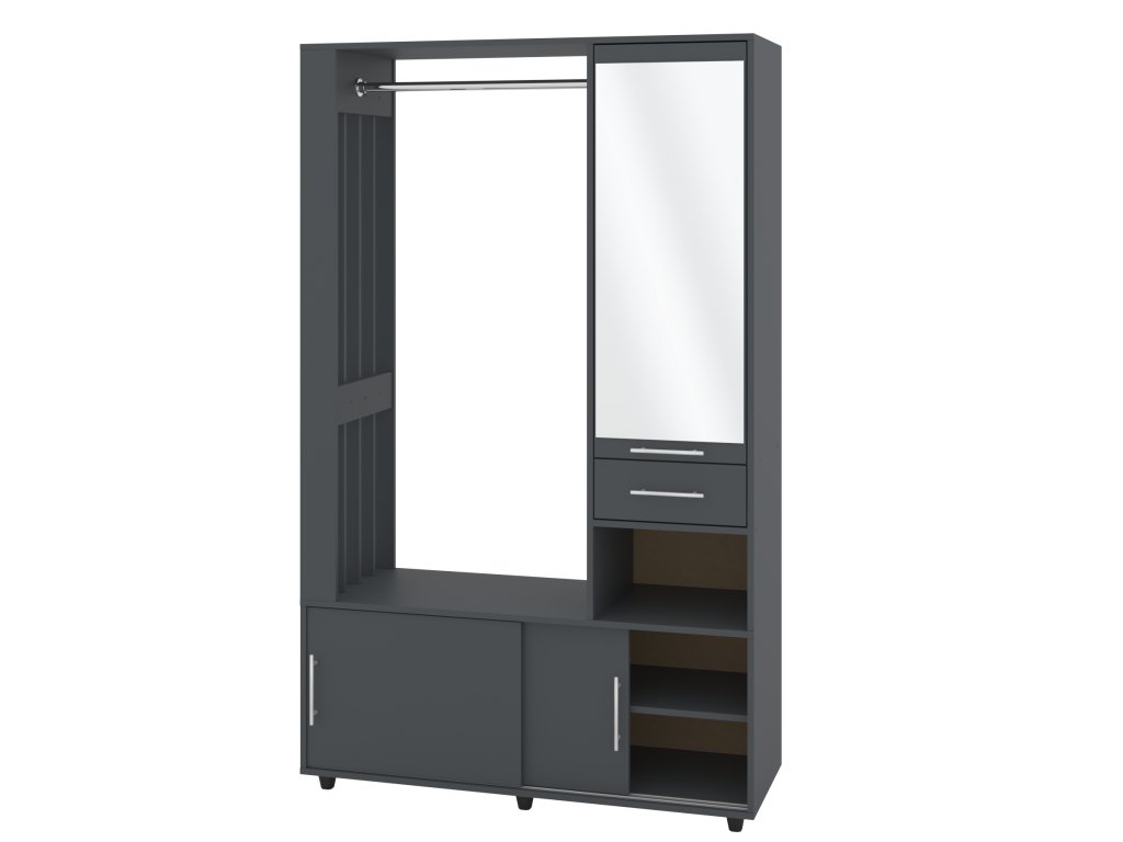 Předsíňová stěna HERMES – Elegantní a praktické řešení pro vaši předsíň. Vylepšete svou předsíň s předsíňovou stěnou HERMES, která spojuje moderní design s praktickými funkcemi. Tento elegantní nábytek nabízí širokou škálu úložných prostorů, které vám pomohou udržet pořádek a zároveň vytvoří stylový dojem ve vašem interiéru. Předsíňová stěna obsahuje šatní tyč, zrcadlo, botník s posuvnými dvířky, praktickou zásuvku a navíc i skrytý policový regál za zrcadlovými dvířky, který nabídne ještě více úložného prostoru.