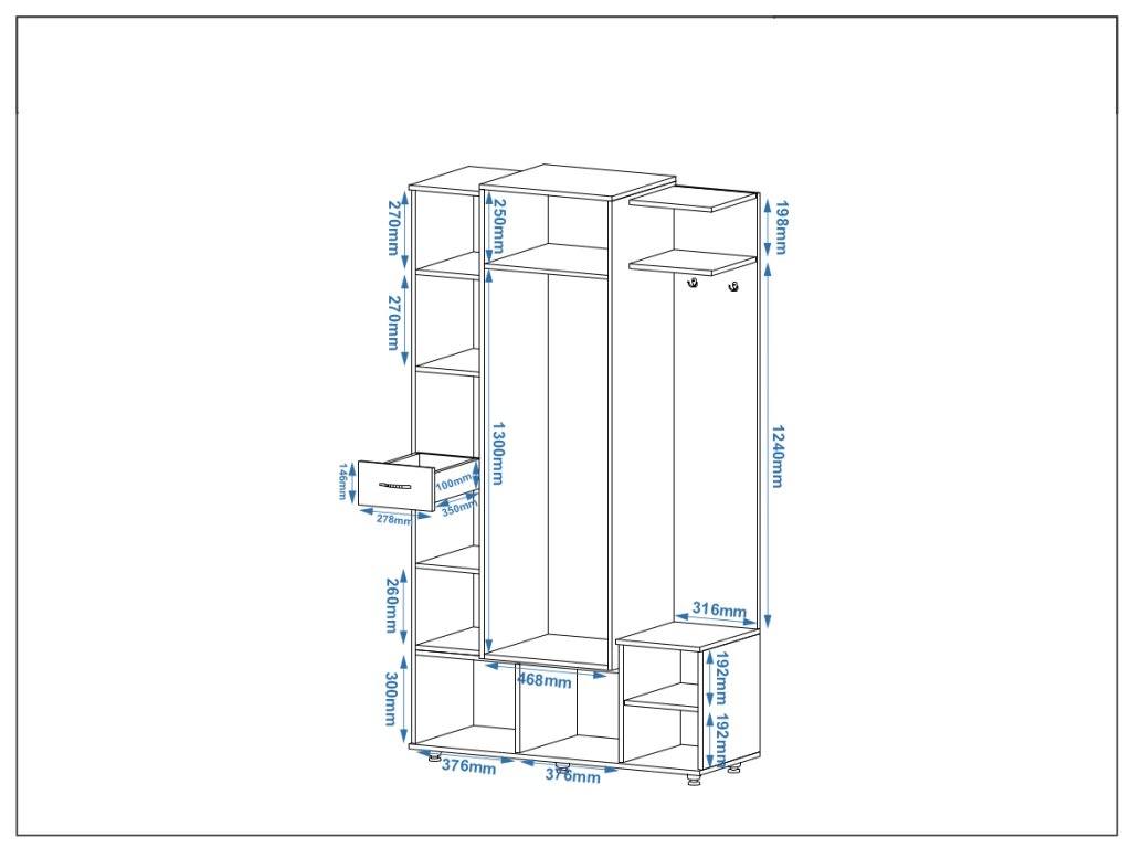 - Komplexní úložné řešení – Vše, co potřebujete pro vaši předsíň, v jednom elegantním kuse nábytku.