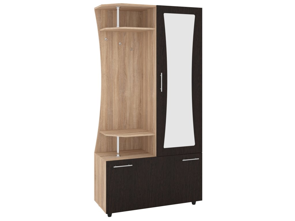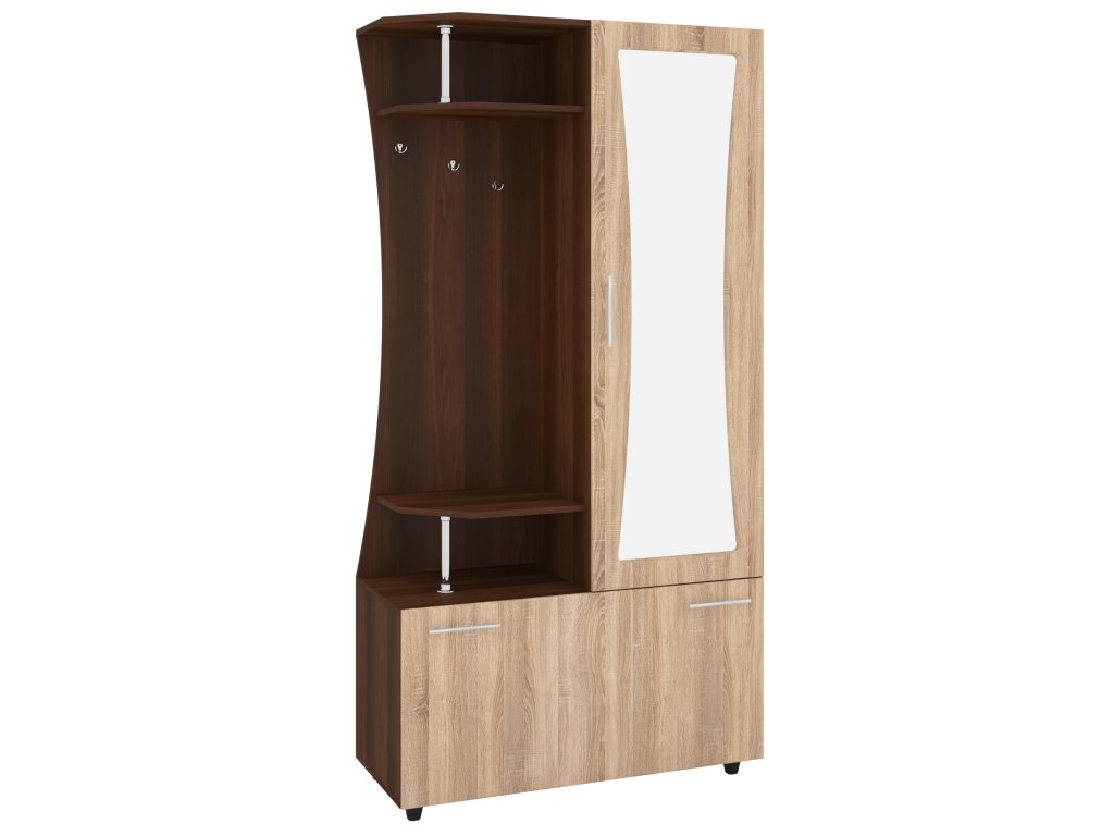 Předsíňová stěna VIZIT MDF je vybavena zrcadlem, které nejen opticky zvětší prostor, ale také vám poskytne praktický odraz pro rychlou kontrolu vzhledu. Kromě toho je stěna vybavena věšákem, který vám poskytne dostatek místa pro kabáty, bundy a další svrchní oděvy. Pro maximální komfort a přehlednost je součástí stěny také šatní skříň s praktickým věšákovým výsuvem a výklopným botníkem s policí, který umožňuje snadné uložení obuvi a dalších drobností.