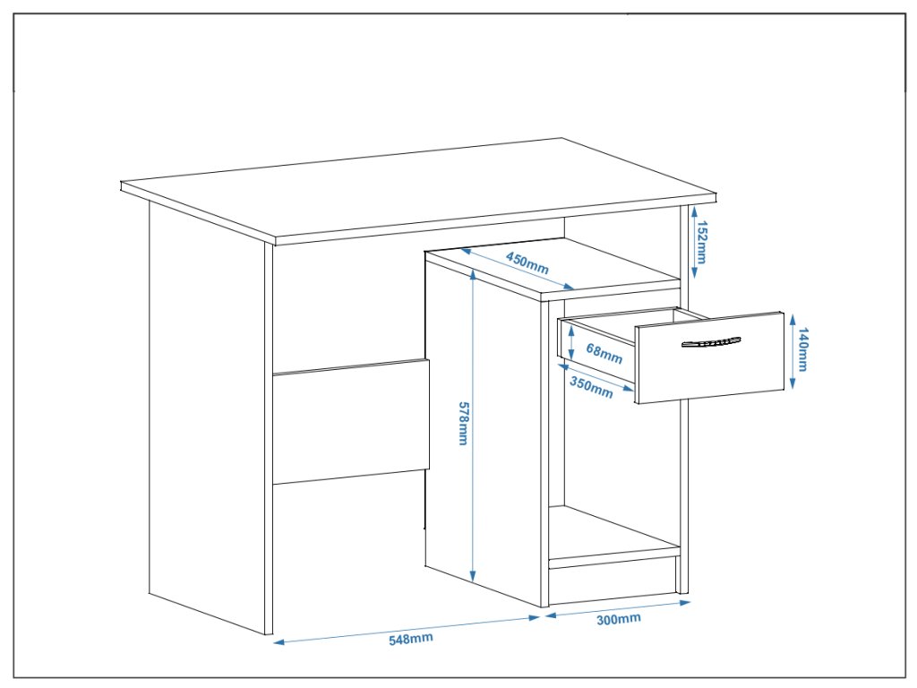 - Praktická zásuvka – ideální pro uložení kancelářských potřeb, dokumentů nebo osobních věcí, což vám pomůže udržet pořádek a produktivitu.