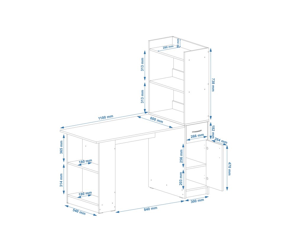 - Praktické úložné možnosti: Stůl je vybavený zásuvkou, skříňkou a policovými regály, které vám umožní snadno uskladnit dokumenty, knihy, kancelářské potřeby nebo osobní věci. Už žádné nepřehledné stohy papírů!