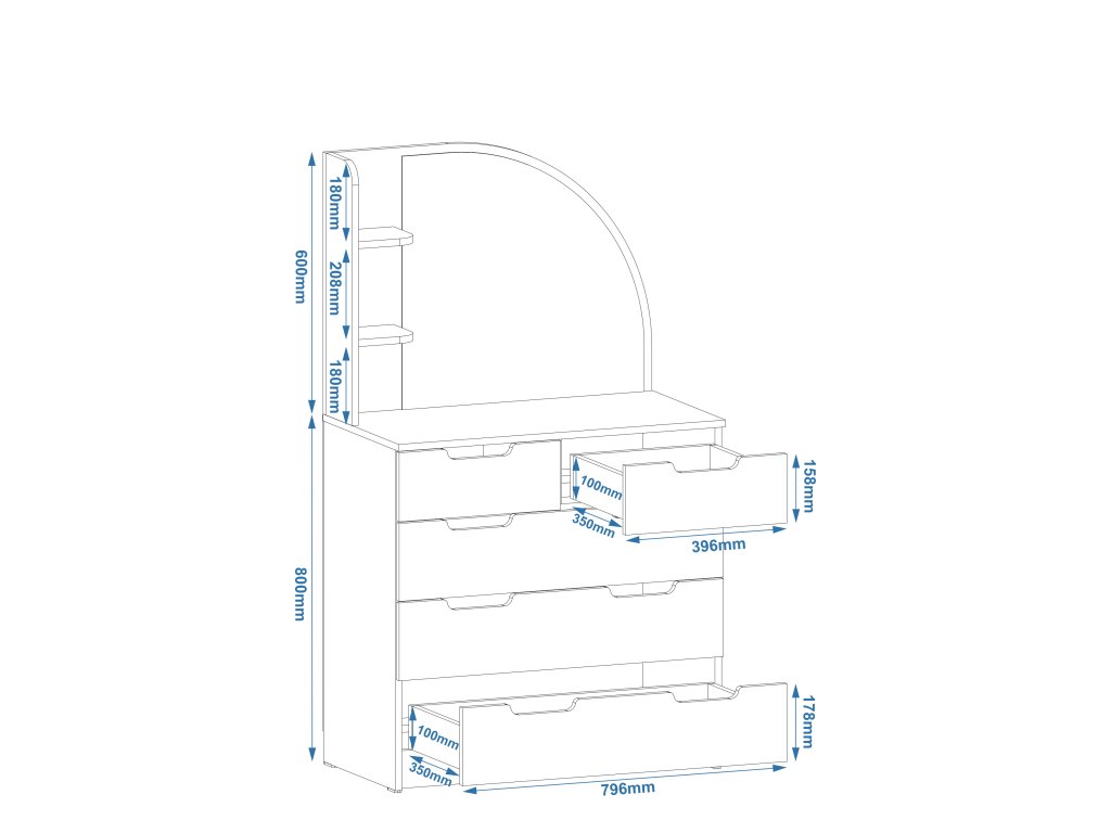 - 5 prostorných zásuvek: Tento toaletní stolek nabízí 5 zásuvek, které poskytují dostatek místa pro kosmetiku, šperky a další osobní doplňky, díky čemuž budete mít vše přehledně uložené.