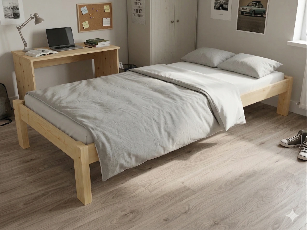 Dřevěná postel 100x200 cm z masivní borovice – VMK14A nabízí pevnost, komfort a přírodní eleganci. Je ideální pro menší ložnice, studentské pokoje nebo hostinské místnosti, kde je důležitá stabilita a dlouhá životnost. Postel je dodávána včetně laťového roštu