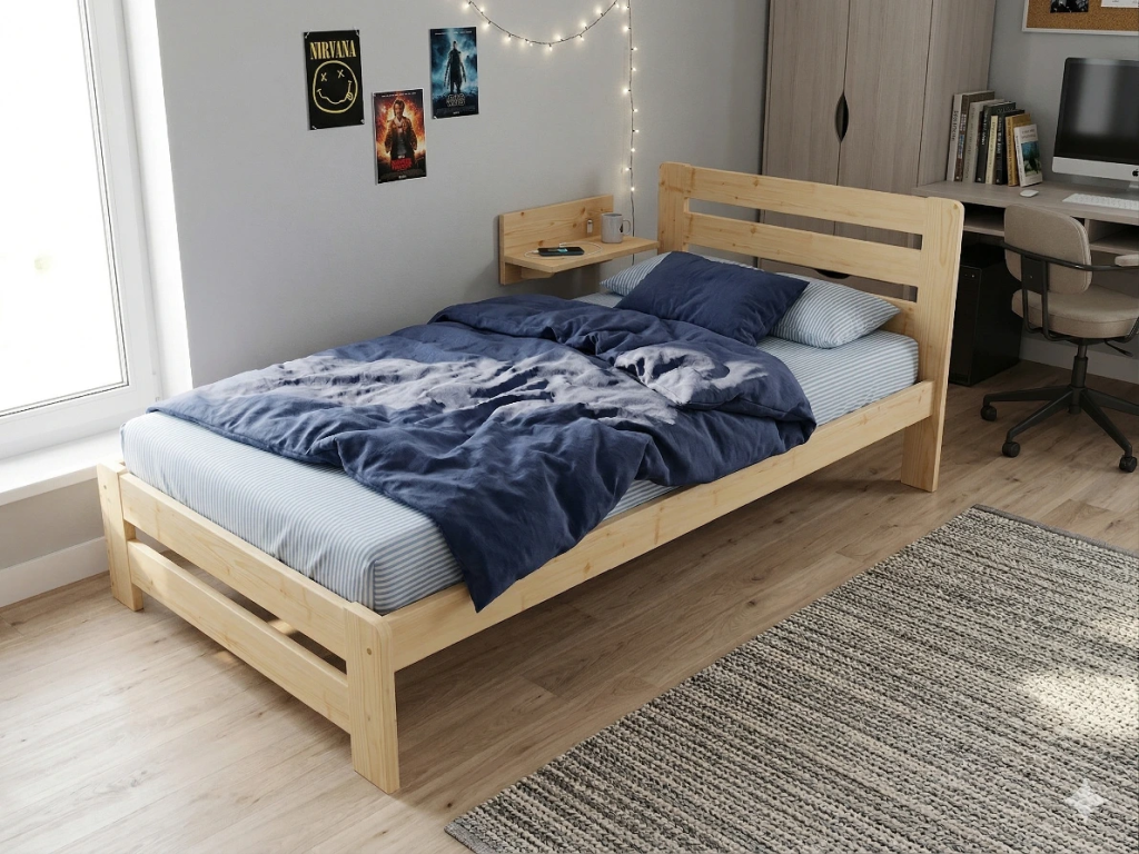Dřevěná postel 100x200 cm z masivní borovice – VMK1B nabízí pevnost, komfort a přírodní eleganci. Je ideální pro menší ložnice, studentské pokoje nebo hostinské místnosti, kde je důležitá stabilita a dlouhá životnost. Postel je dodávána včetně laťového roštu