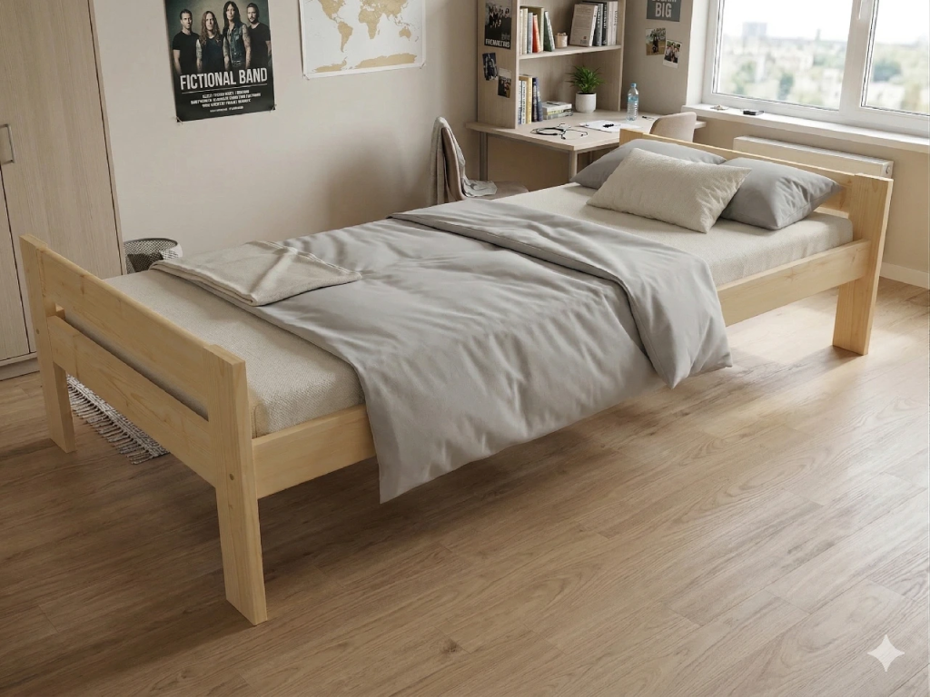 Dřevěná postel 100x200 cm z masivní borovice – VMK6C nabízí pevnost, komfort a přírodní eleganci. Je ideální pro menší ložnice, studentské pokoje nebo hostinské místnosti, kde je důležitá stabilita a dlouhá životnost. Postel je dodávána včetně laťového roštu