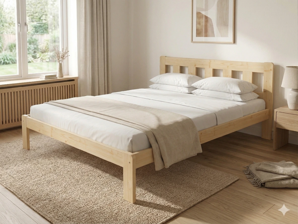 Dřevěná postel 120x200 cm z masivní borovice – VMK10A nabízí pevnost, komfort a přírodní eleganci. Je ideální pro menší ložnice, studentské pokoje nebo hostinské místnosti, kde je důležitá stabilita a dlouhá životnost. Postel je dodávána včetně laťového roštu