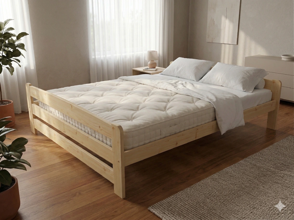 Dřevěná postel 120x200 cm z masivní borovice – VMK9D nabízí pevnost, komfort a přírodní eleganci. Je ideální pro menší ložnice, studentské pokoje nebo hostinské místnosti, kde je důležitá stabilita a dlouhá životnost. Postel je dodávána včetně laťového roštu
