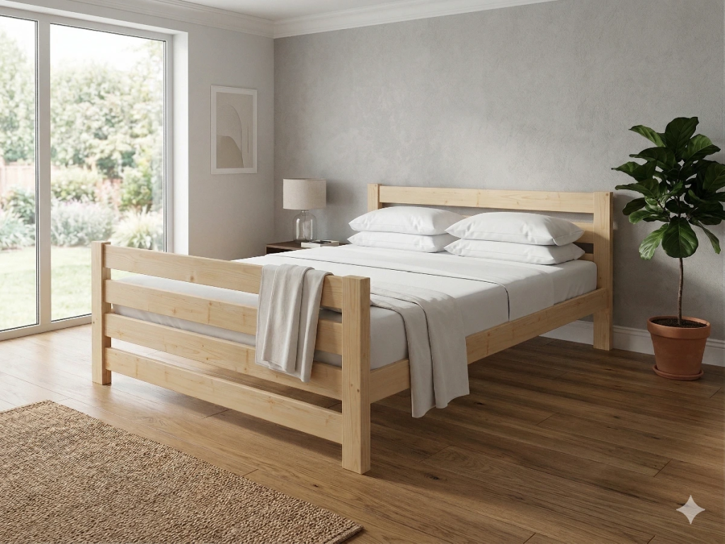 Dřevěná postel 140x200 cm z masivní borovice – VMK11E nabízí pevnost, komfort a přírodní eleganci. Je ideální pro menší ložnice, studentské pokoje nebo hostinské místnosti, kde je důležitá stabilita a dlouhá životnost. Postel je dodávána včetně laťového roštu
