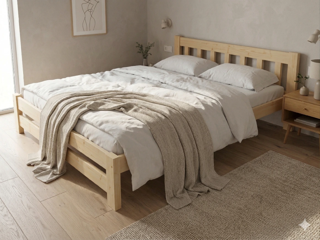 Dřevěná postel 140x200 cm z masivní borovice – VMK15B nabízí pevnost, komfort a přírodní eleganci. Je ideální pro menší ložnice, studentské pokoje nebo hostinské místnosti, kde je důležitá stabilita a dlouhá životnost. Postel je dodávána včetně laťového roštu
