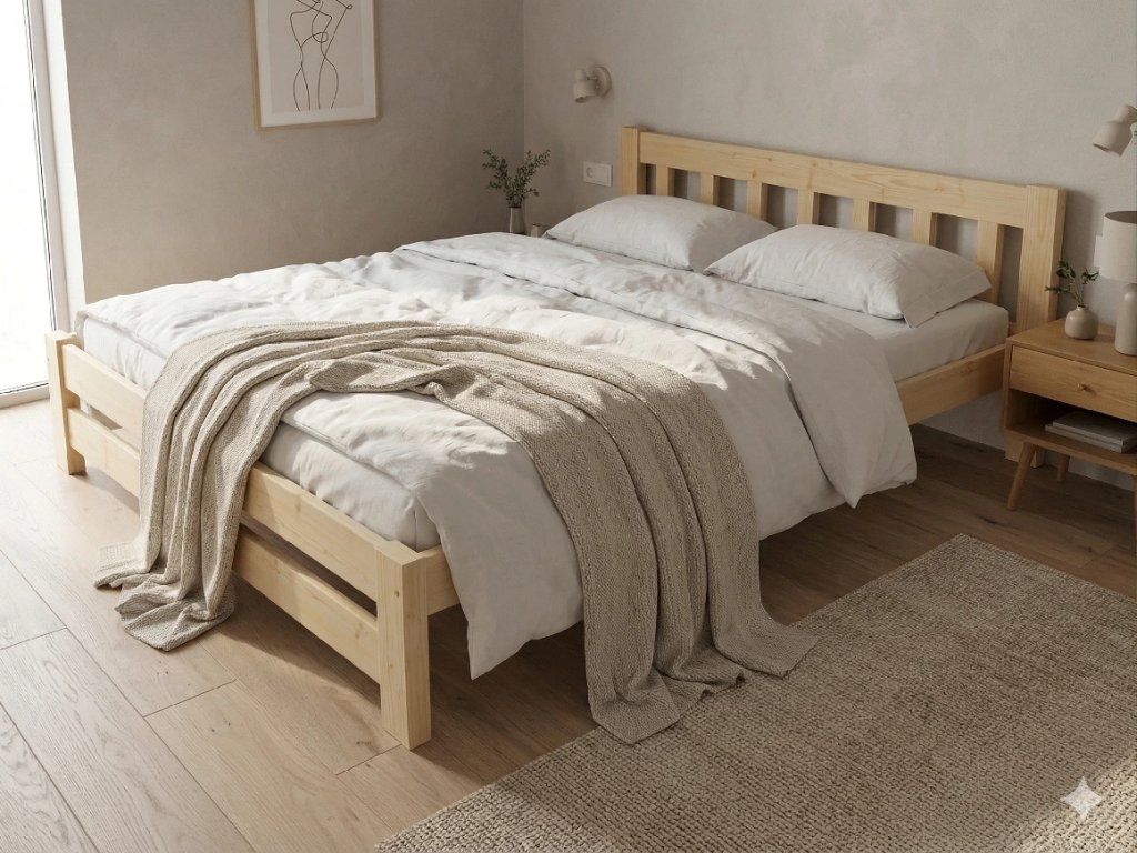 Dřevěná postel 200x200 cm z masivní borovice – VMK15B nabízí pevnost, komfort a přírodní eleganci. Je ideální pro menší ložnice, studentské pokoje nebo hostinské místnosti, kde je důležitá stabilita a dlouhá životnost. Postel je dodávána včetně laťového roštu