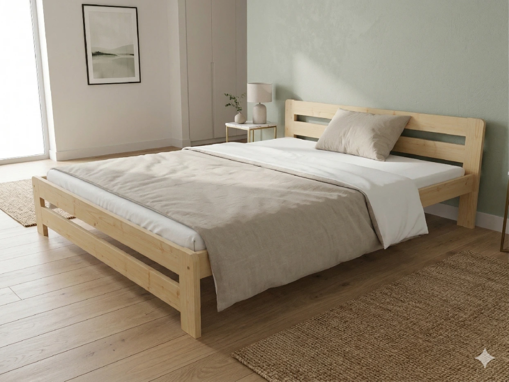 Dřevěná postel 200x200 cm z masivní borovice – VMK2B nabízí pevnost, komfort a přírodní eleganci. Je ideální pro menší ložnice, studentské pokoje nebo hostinské místnosti, kde je důležitá stabilita a dlouhá životnost. Postel je dodávána včetně laťového roštu