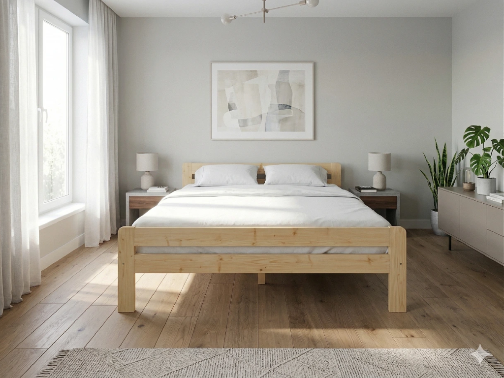 Dřevěná postel 200x200 cm z masivní borovice – VMK2C nabízí pevnost, komfort a přírodní eleganci. Je ideální pro menší ložnice, studentské pokoje nebo hostinské místnosti, kde je důležitá stabilita a dlouhá životnost. Postel je dodávána včetně laťového roštu