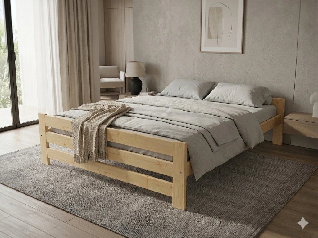 Dřevěná postel 200x200 cm z masivní borovice – VMK6D nabízí pevnost, komfort a přírodní eleganci. Je ideální pro menší ložnice, studentské pokoje nebo hostinské místnosti, kde je důležitá stabilita a dlouhá životnost. Postel je dodávána včetně laťového roštu