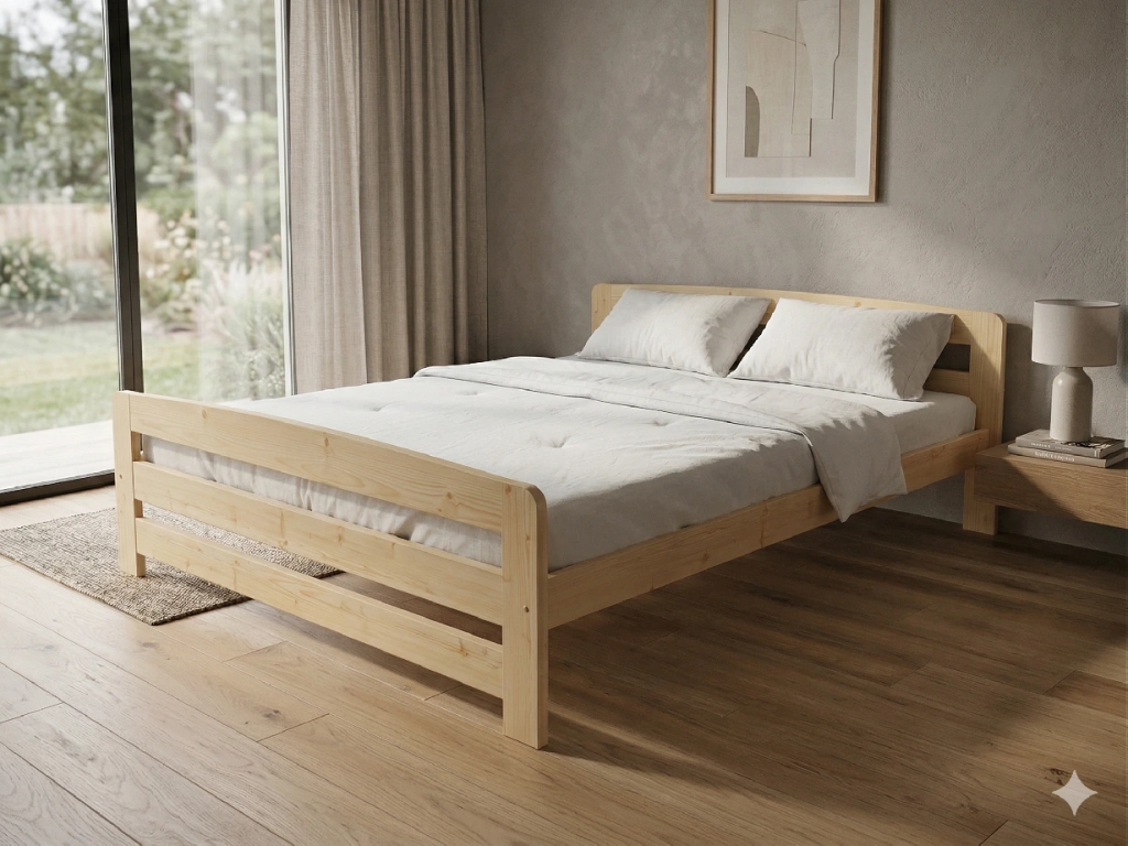 Dřevěná postel 200x200 cm z masivní borovice – VMK8D nabízí pevnost, komfort a přírodní eleganci. Je ideální pro menší ložnice, studentské pokoje nebo hostinské místnosti, kde je důležitá stabilita a dlouhá životnost. Postel je dodávána včetně laťového roštu