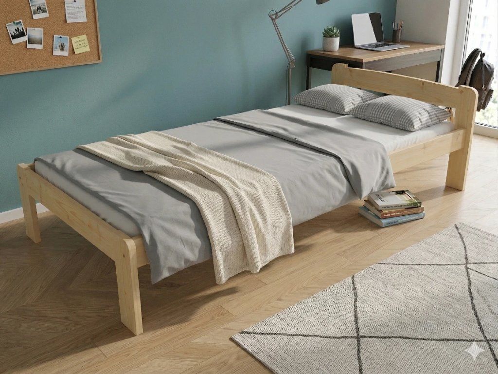 Dřevěná postel 80x200 cm z masivní borovice – VMK9A nabízí pevnost, komfort a přírodní eleganci. Je ideální pro menší ložnice, studentské pokoje nebo hostinské místnosti, kde je důležitá stabilita a dlouhá životnost. Postel je dodávána včetně laťového roštu