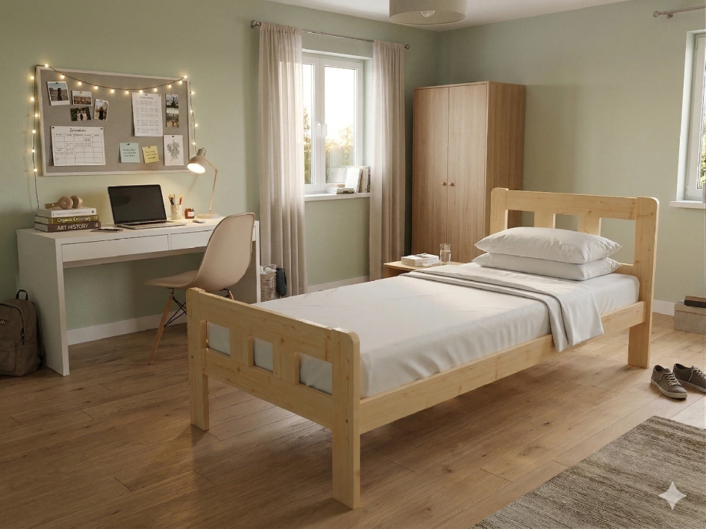 Dřevěná postel 90x200 cm z masivní borovice – VMK10E nabízí pevnost, komfort a přírodní eleganci. Je ideální pro menší ložnice, studentské pokoje nebo hostinské místnosti, kde je důležitá stabilita a dlouhá životnost. Postel je dodávána včetně laťového roštu