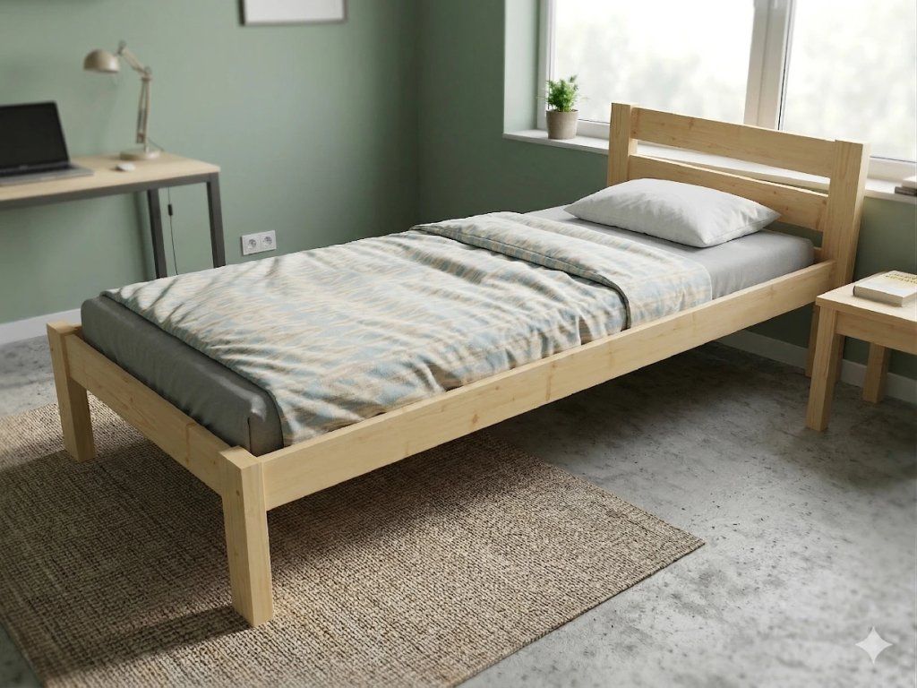 Dřevěná postel 90x200 cm z masivní borovice – VMK12A nabízí pevnost, komfort a přírodní eleganci. Je ideální pro menší ložnice, studentské pokoje nebo hostinské místnosti, kde je důležitá stabilita a dlouhá životnost. Postel je dodávána včetně laťového roštu