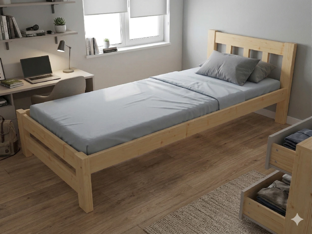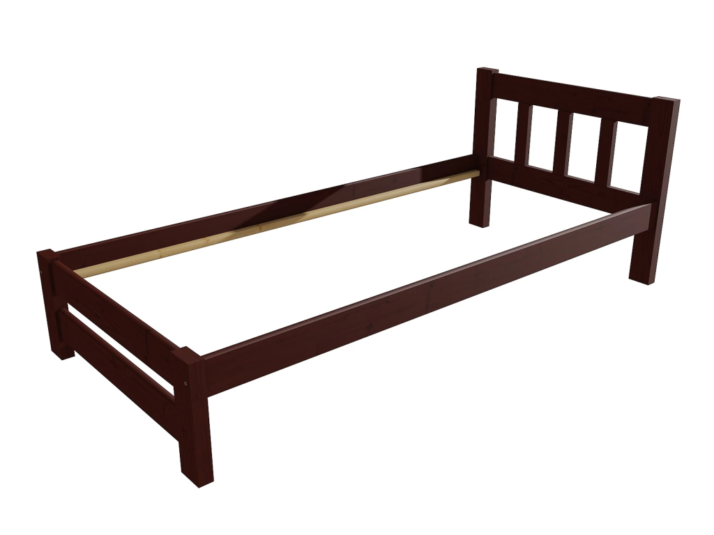 Dřevěná postel 90x200 cm z masivní borovice – VMK15B nabízí pevnost, komfort a přírodní eleganci. Je ideální pro menší ložnice, studentské pokoje nebo hostinské místnosti, kde je důležitá stabilita a dlouhá životnost. Postel je dodávána včetně laťového roštu