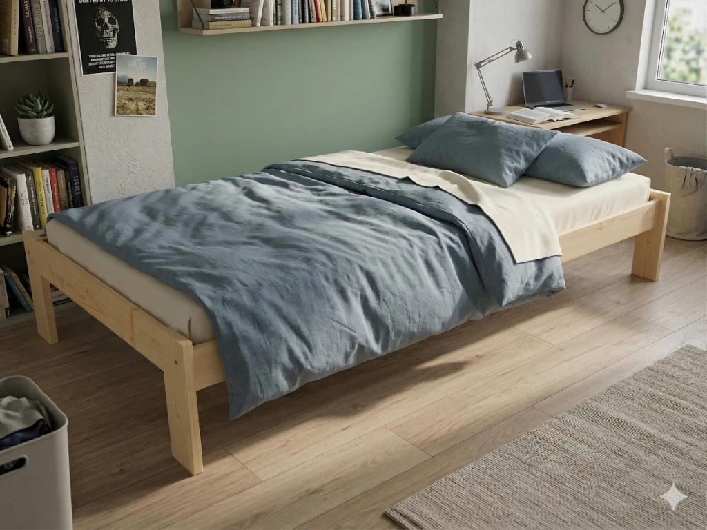 Dřevěná postel 90x200 cm z masivní borovice – VMK7A nabízí pevnost, komfort a přírodní eleganci. Je ideální pro menší ložnice, studentské pokoje nebo hostinské místnosti, kde je důležitá stabilita a dlouhá životnost. Postel je dodávána včetně laťového roštu