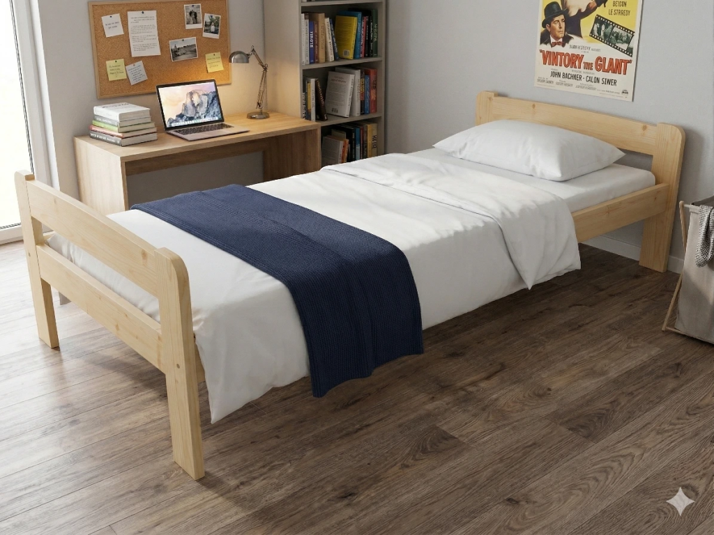 Dřevěná postel 90x200 cm z masivní borovice – VMK9C nabízí pevnost, komfort a přírodní eleganci. Je ideální pro menší ložnice, studentské pokoje nebo hostinské místnosti, kde je důležitá stabilita a dlouhá životnost. Postel je dodávána včetně laťového roštu
