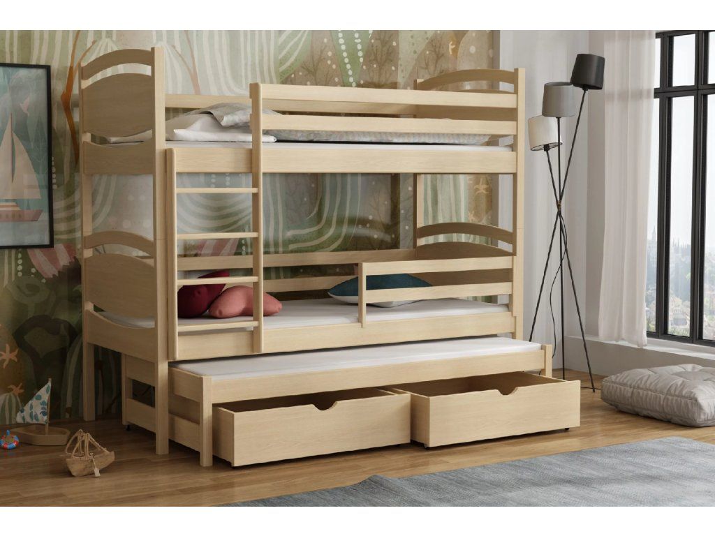 Hledáte praktické a stylové řešení spaní pro tři děti nebo časté návštěvy? Tato patrová postel s výsuvným spodním lůžkem je ideálním řešením do menších pokojů, kde je každý centimetr drahocenný. Dvě pevná lůžka nad sebou a třetí výsuvné lůžko skrytě uložené ve spodní části zajistí pohodlný spánek pro tři osoby, aniž by zabíraly zbytečně moc místa.